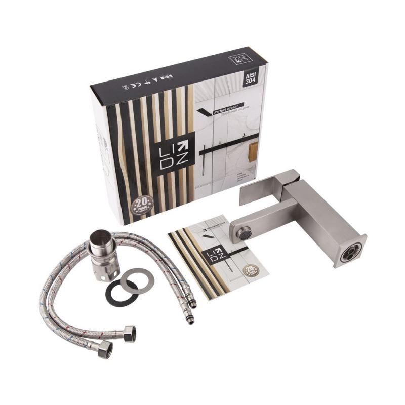 Змішувач для раковини Lidz (NKS) 10 30 001 00 виготовлений з нержавіючої сталі, яка не схильна до корозії, стійка до ударів і тріщин. Нікельована брашована поверхня надає змішувачу не тільки міцності, але і оригінального зовнішнього вигляду. Інтенсивність водного потоку та температура регулюються за допомогою переміщення важеля. Підключення води відбувається через гнучкі шланги з діаметром підключення 1/2", які входять до комплекту постачання.