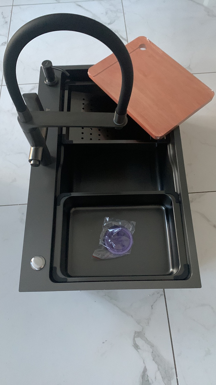 Вбудована мийка має стильний чорний колір, а змішувач із гнучким виливом і дворівневим східчастим дизайном може бути переміщення вправо або вліво всередині мийки, що дає змогу економити воду, час і зусилля. Глибока та простора раковина дає змогу розмістити каструлі без бризок і легко впоратися з миттям столового приладдя.